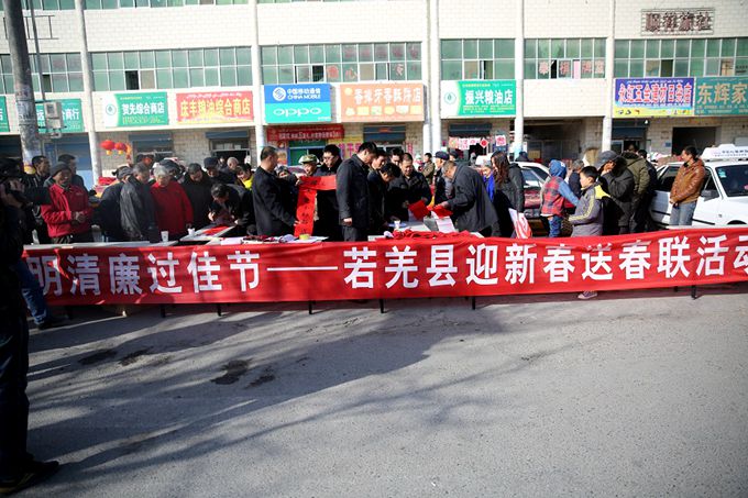 “旧岁又添几个喜,新年更上一层楼”、“民安国泰逢盛世,风调雨顺颂年华”,一副副春联传递着若羌县对新春的期盼、对新春的祝愿。2月12日,县纪委、县文明办在新苑市场路口联合开展“文明清廉过佳节”迎新春送春联活动,向来往的居民群众及党员干部赠送春联,县书法协会的老师现场为居民撰写春联。