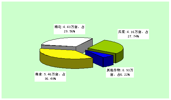2014年,全县农作物种植面积14.98万亩,同比下降12.30%,其中:粮食种植面积5.46万亩,同比下降1.61%;棉花种植面积4.43万亩,同比下降15.17%;瓜菜种植面积4.16万亩,同比下降8.99%;其他作物种植面积0.93万亩,同比下降46.49%。